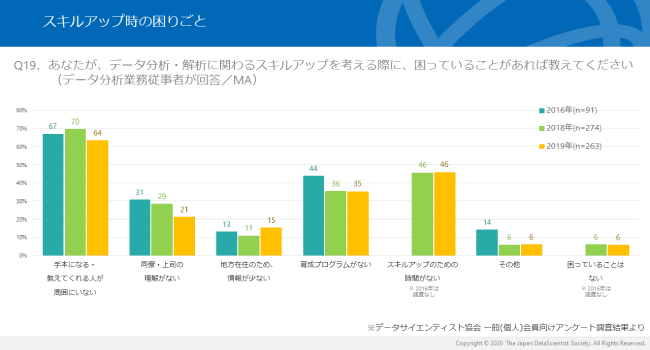 「スキルアップ時の困りごと」に関する項目では、「育成プログラムがない」「同僚・上司の理解がない」はやや減少傾向にあると言えます。これは、上述の結果にも符号しています。