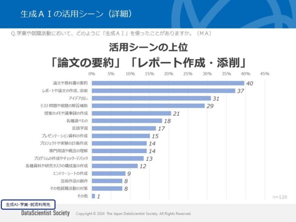 活用シーンの上位は、「論文や教科書の要約」の40%、「レポートや論文の作成、添削」の37%となっています。
