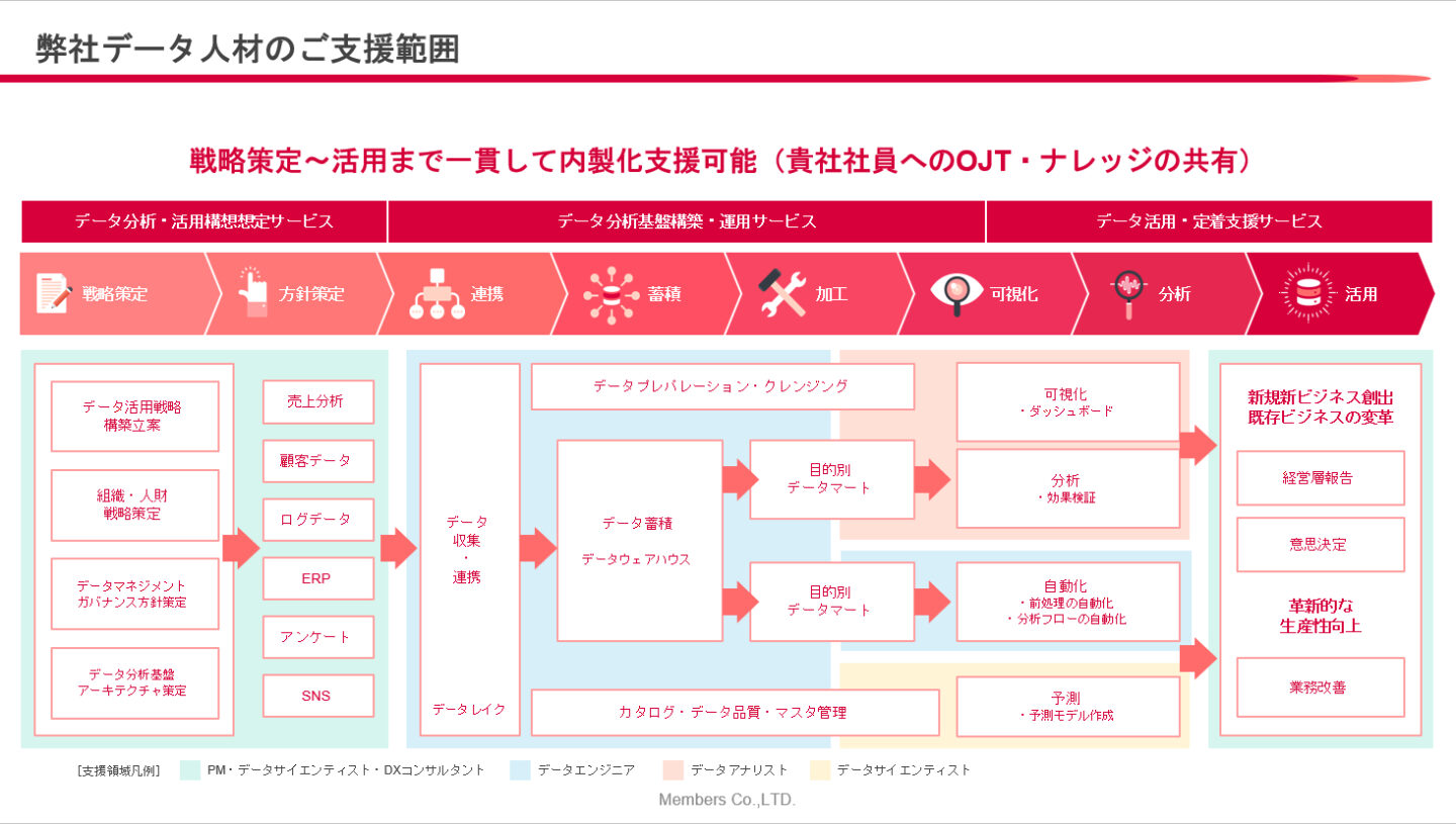 秋山さん: はい。現在の主力商品は、データ領域のプロフェッショナル人材の常駐サービスがメインで、私のようなデータサイエンティストやアナリスト、エンジニアなどがお客様の課題や要求に応じて常駐しています。