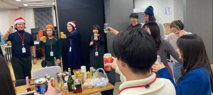 全社で集まる機会は月1回オンラインで集まる「帰社会」や、3ヶ月に1回オフラインで集まる懇親会などがあり、ワンシーズンに1回くらいは大人数での飲み会が企画されています。