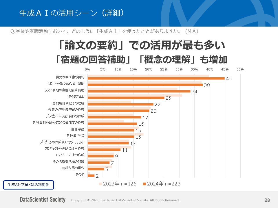 学業で使ったことがあるのは72%で前回の68%から4ポイント増、一方プライベートで使ったことがあるのは49%で前回の52%から3ポイント減となっております。活用シーンでの大きな変化は見られておりません。では、その学業でどのようなシーンで使っていたのかがこちらの結果となります。