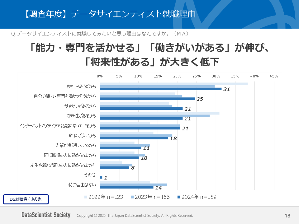 データサイエンティストへの就職理由としては2024年に比べて「能力・専門を活かせる」が25%、「働きがいがある」が21%と前年よりも伸びを見せています。この背景としては様々な大学においてデータサイエンス学部や機械学習、数理統計学に関連する講義も年々増えており、自分の学んだことを活かせるという点でも、データサイエンティストを目指す学生も増えていっているのではないでしょうか。