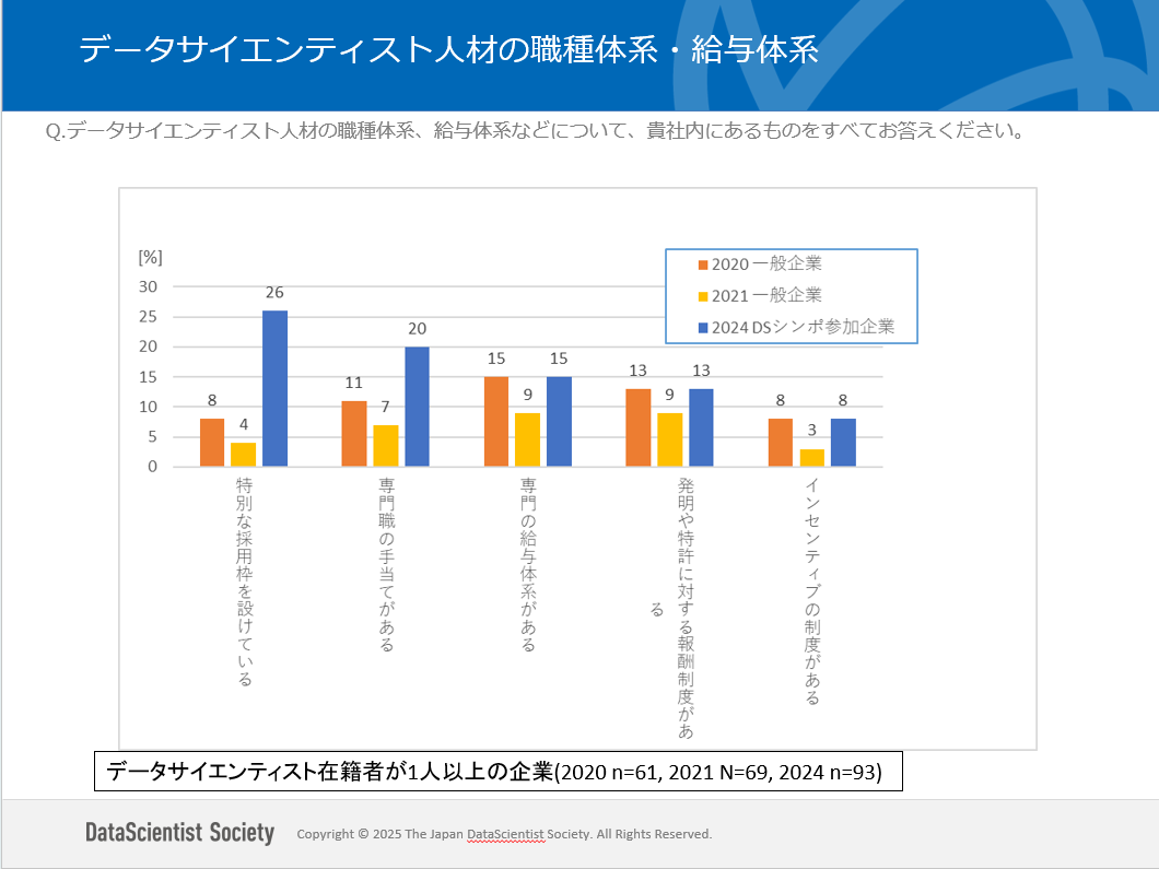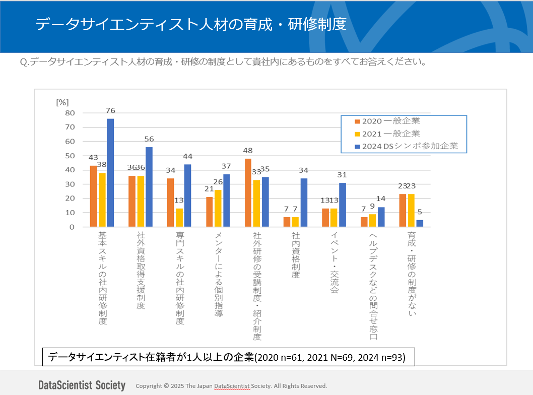データサイエンティスト協会では、2024年11月に開催したデータサイエンティスト協会11thシンポジウムにおいて、参加した企業担当者向けにデータサイエンティスト(以下 DS)の採用に関するアンケート調査を行いました。ここでは、データサイエンティスト人材確保の施策となる企業の人材育成・研修の制度や職種体系・給与体系についての聴取結果をご紹介します。