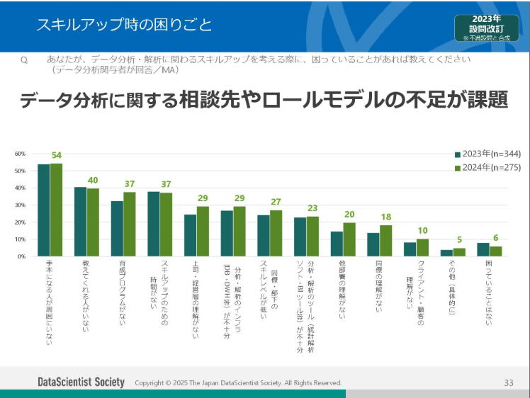 そこで「あなたが、データ分析・解析にかかわるスキルアップを考える際に、困っていることがあれば教えてください」という設問を多重回答式で聴取した結果が以下のグラフですが、「手本になる人が周囲にいない」、「教えてくれる人がいない」など、データ分析に関する相談先やロールモデルの不足が課題になっています。それは企業側の施策しての「専門スキルの社内研修制度」や「メンターによる個別指導」の充実がより望まれていることを示していると思われます。