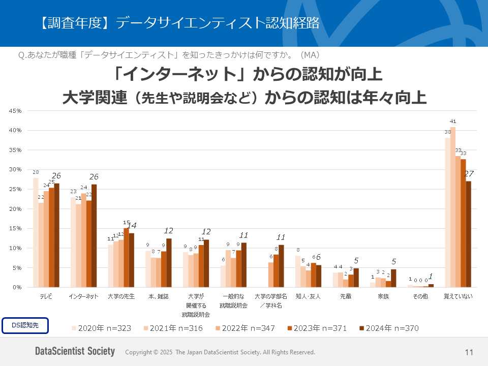 - DSの認知経路は、テレビ・ネットが依然として高いが、大学関連からの認知が高くなる傾向が続く