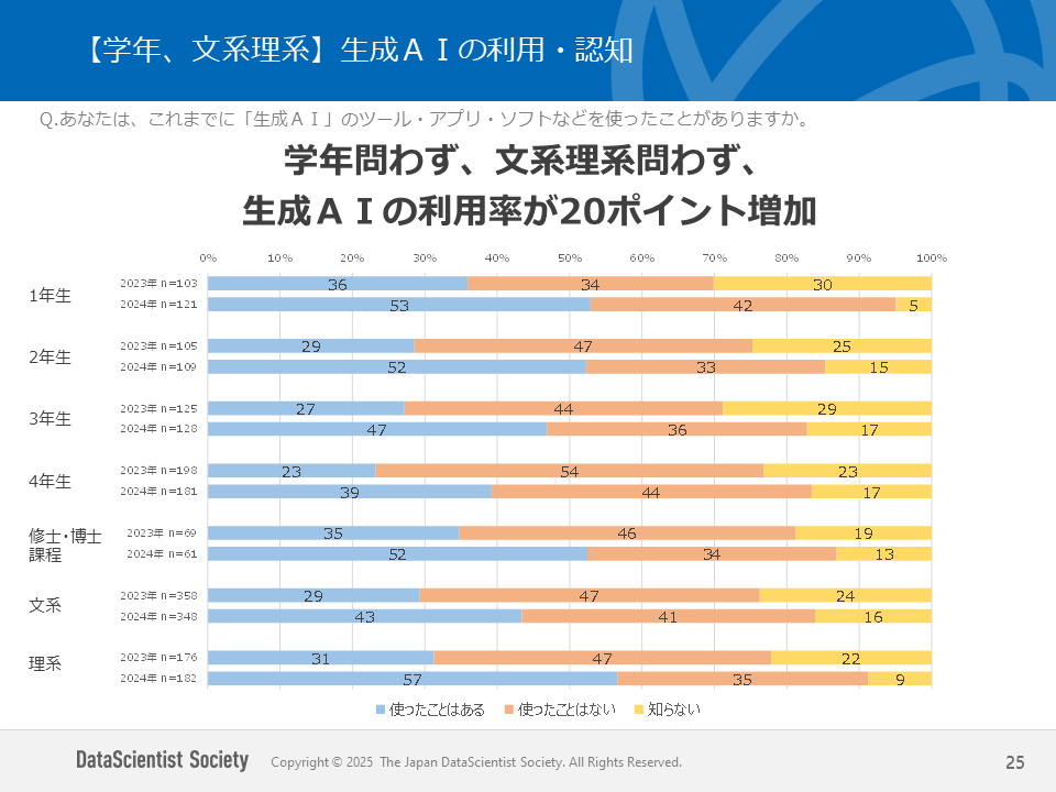 データサイエンティストの認知は62%で高止まり、生成AI利用率はこの1年で27→47%に大幅増加
