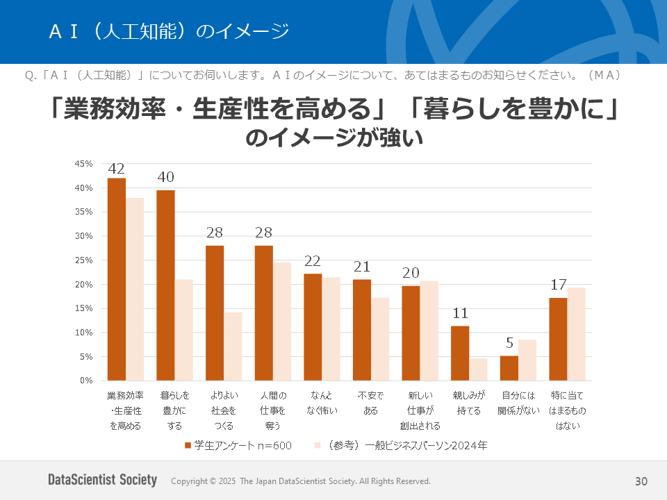 - 業務効率・生産性を高める、暮らしを豊かにする、といったポジティブなイメージを持つ学生が40%程度と最も高い