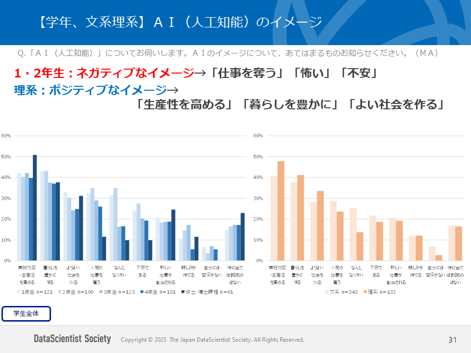 - 一方で、1・2年生や文系学生では、ややネガティブなイメージも高い