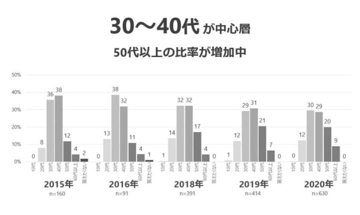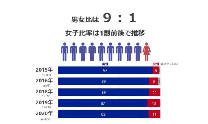 ・DS(アンケートに答えた協会一般(個人)会員)の男女比は9:1。中心層は30代~40代、ほぼ大卒以上
