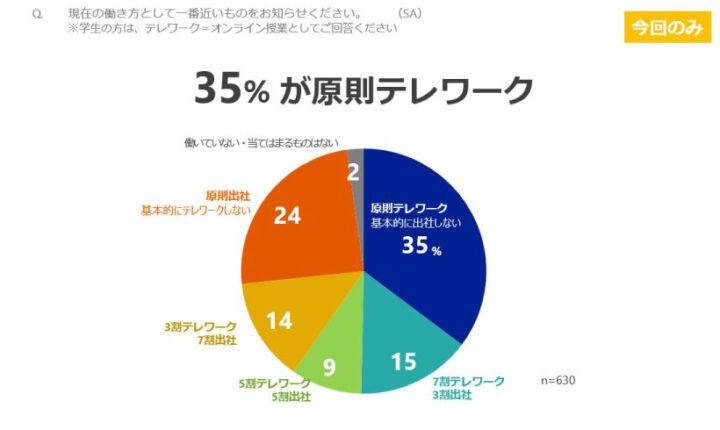 ・コロナ禍で働き方環境が変化する中、テレワーク中心でも業務量は61%が「変化なし」と回答し安定している