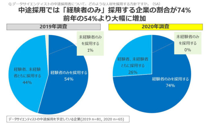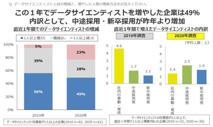 ・データサイエンティストを直近1年で増やした企業は49%。中途採用や新卒採用が増加傾向