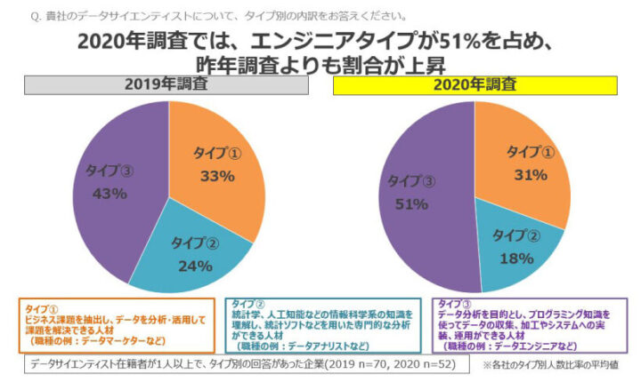 ・企業に在籍するDSのタイプでは「エンジニアタイプ」が51%。2019年調査より8%増加